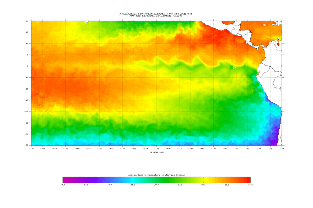 SST of the Pacific Ocean on 6/6/25 // Courtesy: NOAA’s Office of Satellite and Product Operations – ospo.noaa.gov