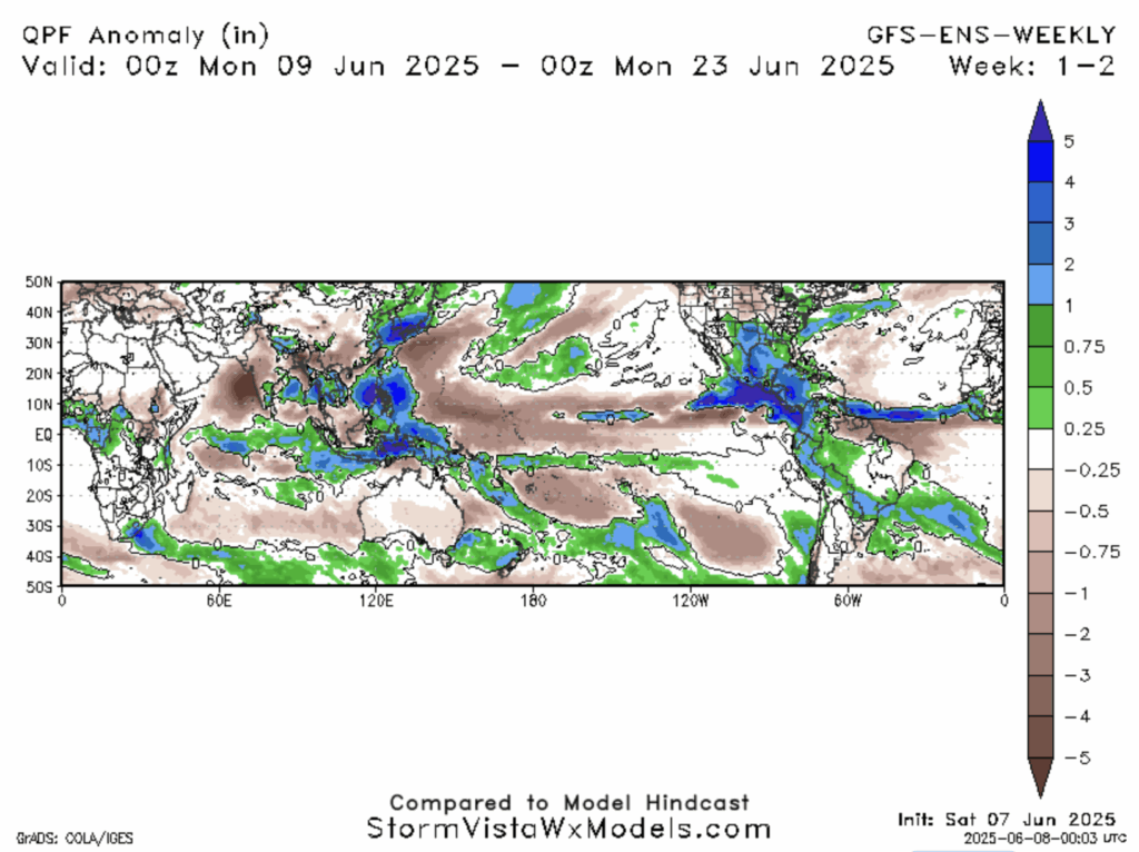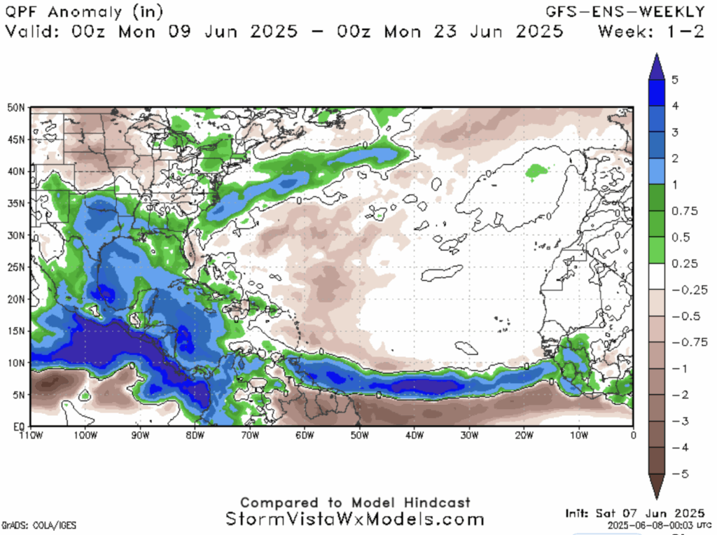 GFS QPF Anomaly for 6/9/25 to 6/23/25 // Courtesy: StormVista – stormvistawxmodels.com