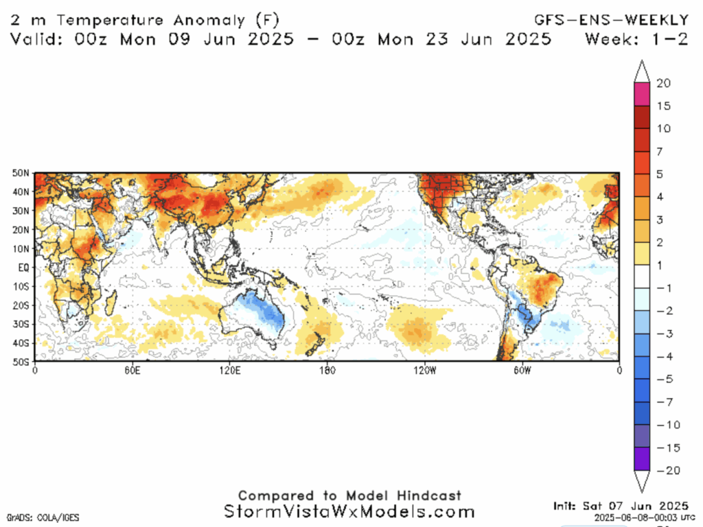 GFS Temperature Anomaly for 6/9/25 to 6/23/25 // Courtesy: StormVista – stormvistawxmodels.com