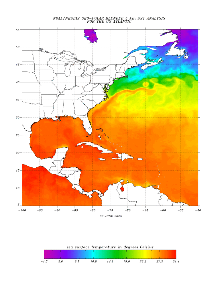 SST of the US Atlantic on 6/6/25 // Courtesy: NOAA’s Office of Satellite and Product Operations – ospo.noaa.gov