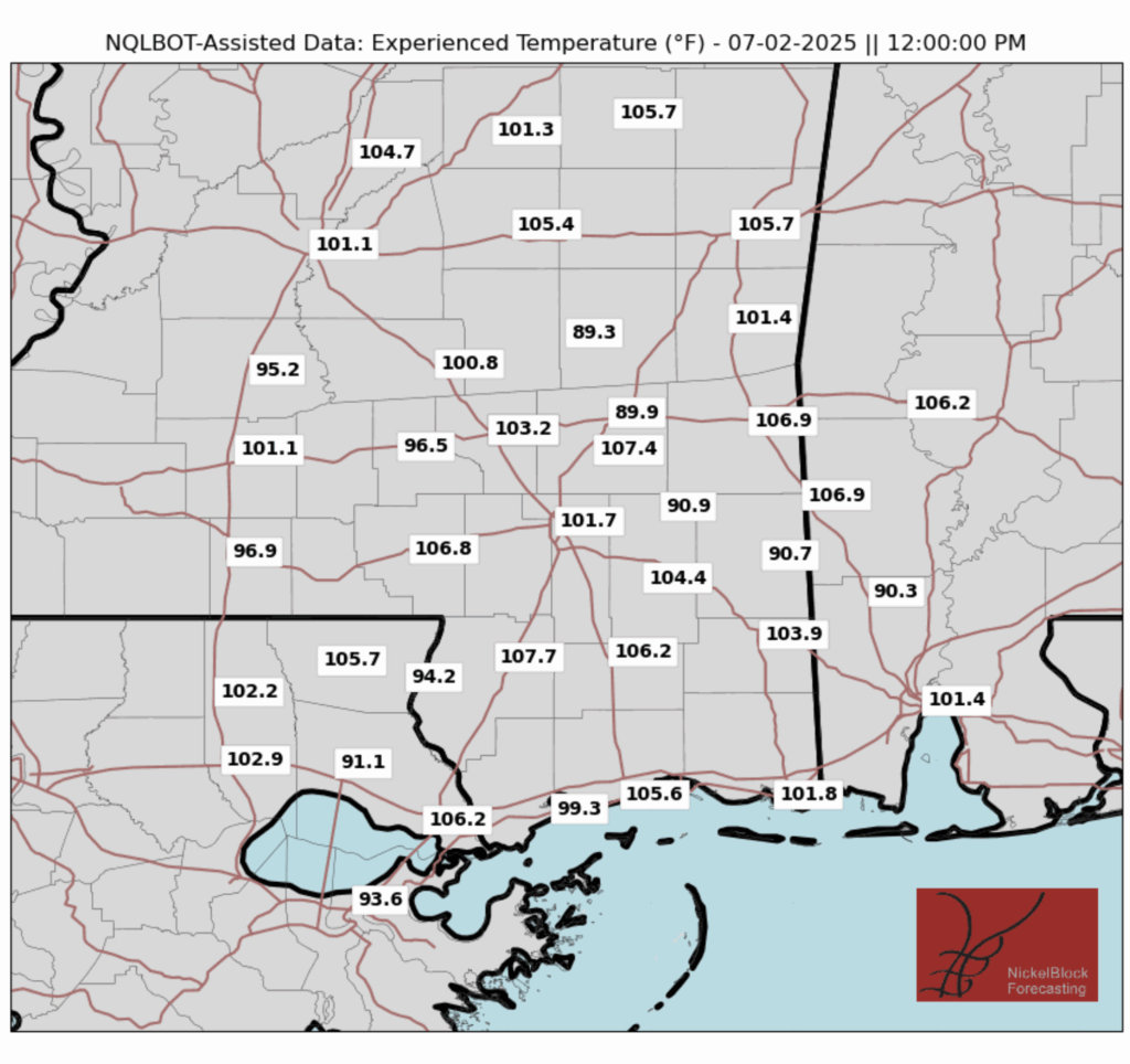 For a closer look at how hot it might “feel like” today, check out the experienced temperatures for today at noontime: