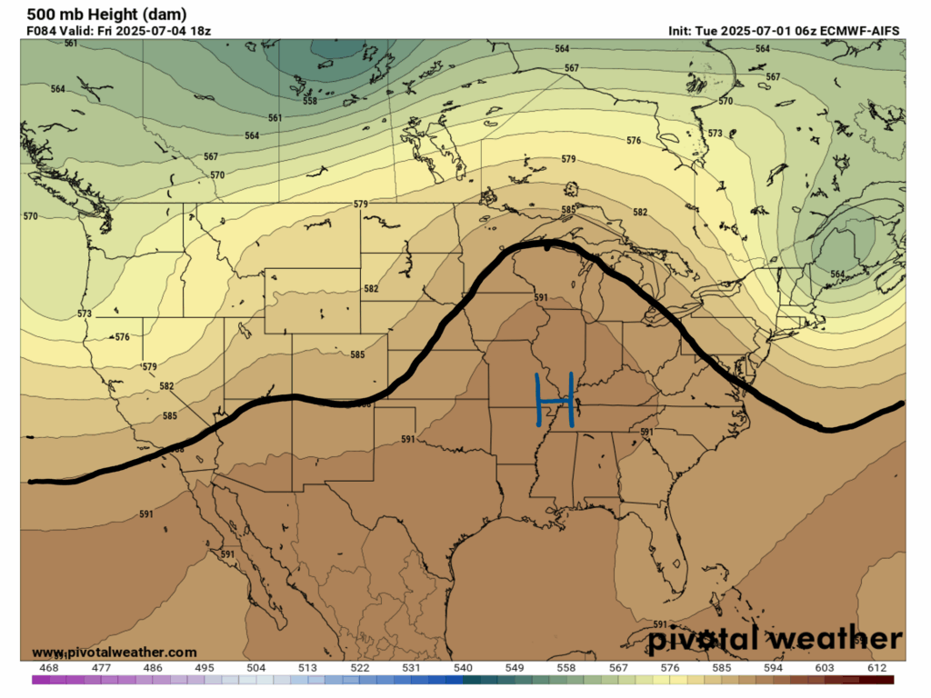 Our upper-level chart for Friday afternoon shows a big ridge building in over us, bringing us more clearer weather, with an area of high pressure over the region. This high pressure will keep us nice and dry – check out the radar for the 4th: