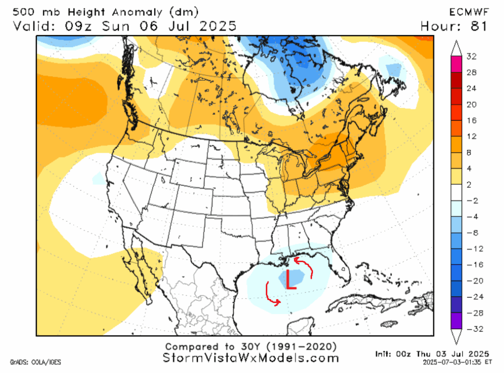 On Sunday, the current high pressure in the gulf will be replaced with a trough, potentially rotating up more Gulf moisture and causing upward forcing needed for convection. Sunday looks to be the wetter day this weekend.