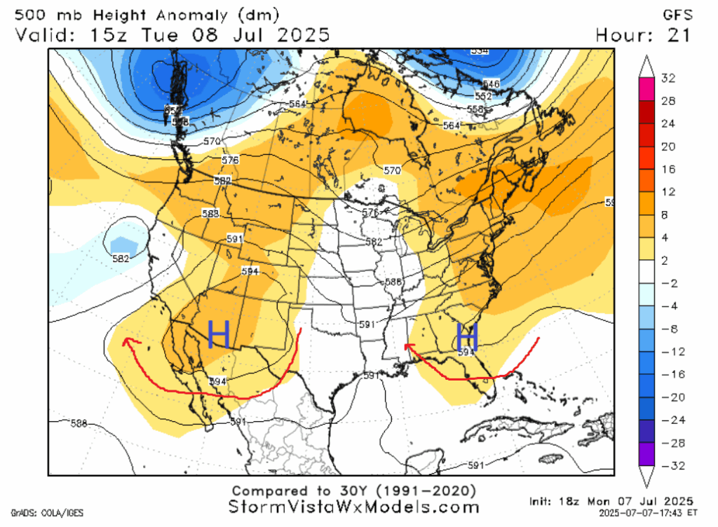 It seems that the trough will abate this weekend, potentially signaling a return to more average conditions, both temperature and precipitation wise. Some guidance does show a surface high pressure forming in the northern Gulf Sunday into Monday, which would cause southerly wind, moisture advection, and potentially wetter conditions (especially further north where there’d be less sinking air).