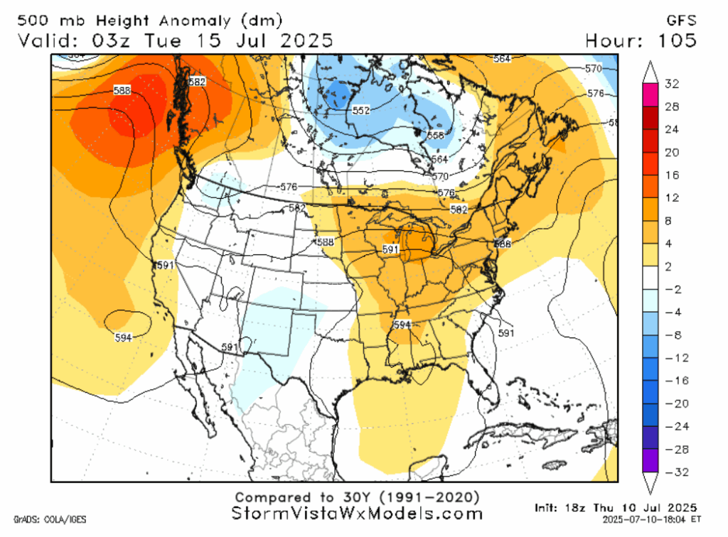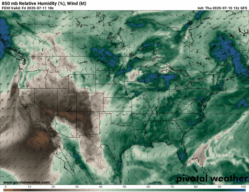 The above image shows feels like temperatures for the area. You may notice that some locations that are merely in the 80s are adjacent to locations well in the triple digits. The areas with lower apparent temperatures, in our model’s estimation, probably got an afternoon storm to cool things down. As tacky as the saying “It’s not the heat, it’s the humidity that gets you” is, it will be true today. The actual temperatures will be seasonably average, but high dew point values will contribute to oppressive conditions in sunny areas. Unless you’re near the ocean, there won’t be too much wind to cool things down outside of thunderstorm downdrafts.