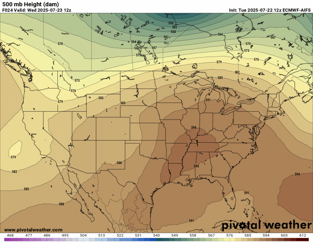 Looking at our upper-air chart, we have a low pressure area off of the coast of California, and an area of high pressure over the Southern US, creating a heat dome over us, helping to bring in the scorching temperatures.