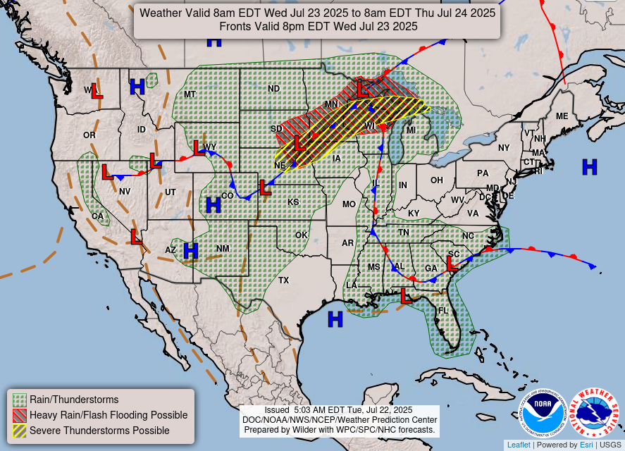 Now taking a look at the WPC’s surface chart for today, there is rain and thunderstorms forecasted for all of our forecast region, and there is a stationary front and low pressure system nearby, fueling the upcoming rainfall by the end of the week.