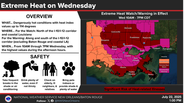 Today will be extremely hot, with heat indices in some areas forecasted to reach 115 degrees. It will be very important now more than ever to be extremely careful in the heat today. If you are able to stay in the air conditioning today, stick with that. If you need to be outside today, be sure to stay very hydrated and take lots of breaks in the shade while outdoors.