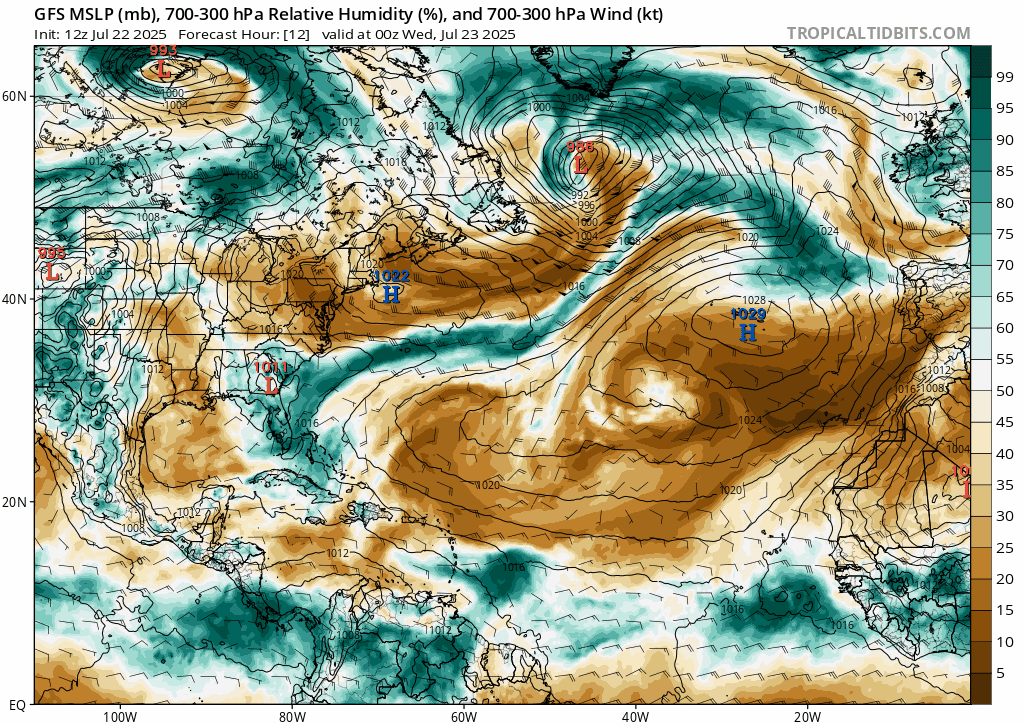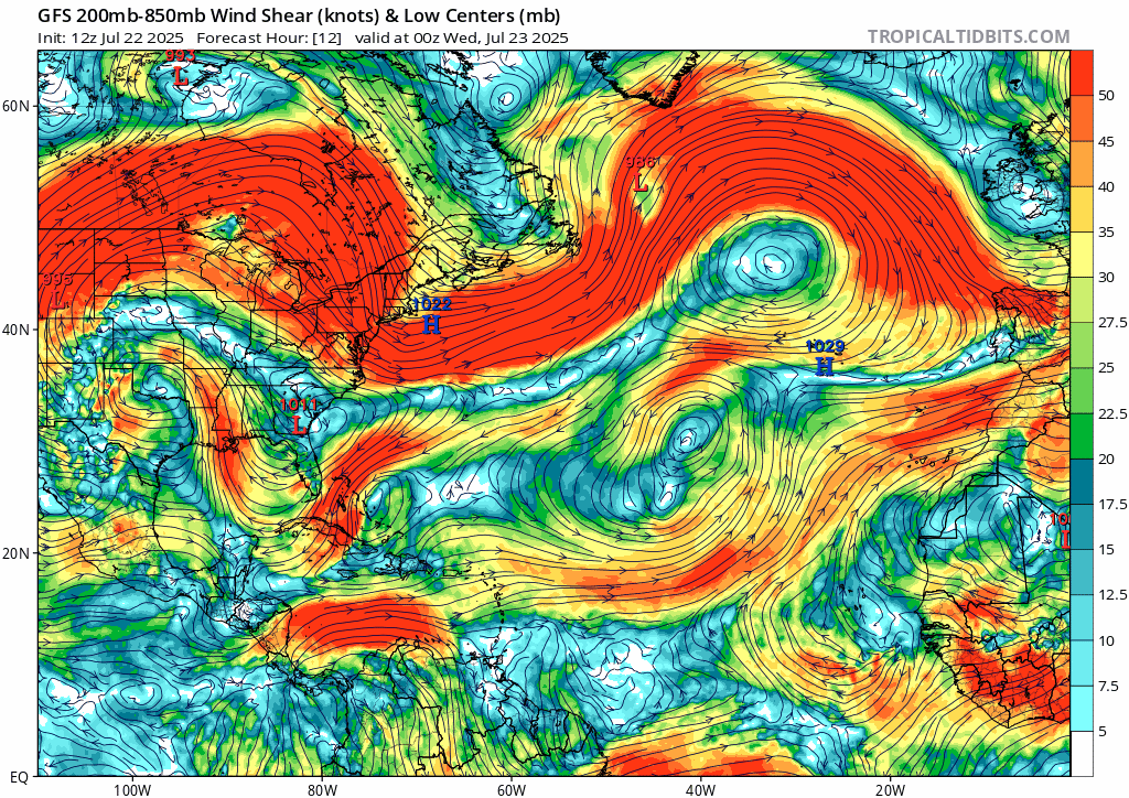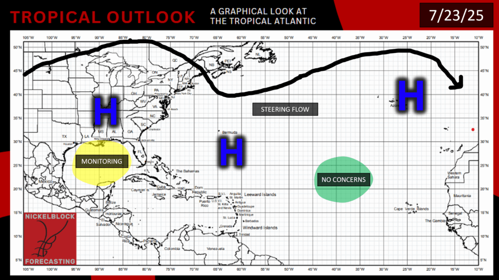 Currently, we have areas of high pressure spanning from the Southeast, Bermuda, and the Azores. The former area of interest approaching the Caribbean is no longer a concern, and the NHC has one other highlighted area moving into the Gulf. The conditions of the previous disturbance were not supportive enough for the area to become an issue, with minimal moisture and high wind shear inhibiting the storm’s organization and development.