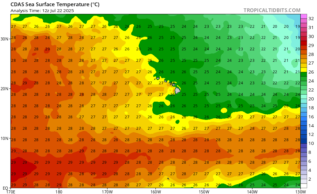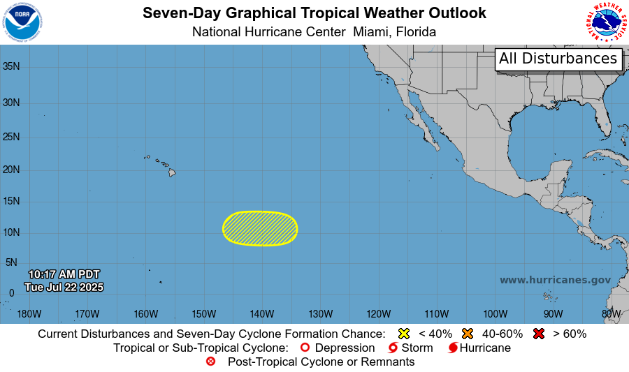 There is one disturbance in the East Pacific as of right now, and has a 20% chance of development in the next 7 days. At around 10-15 mph, this system is slowly moving westward. There are some bands of disorganized showers and if the forecasted low pressure area does form later this week, it may slowly develop further. Regardless of development, this system will likely avoid landfall on Hawaii as it is currently moving westward, and moving toward Hawaii, the system would encounter colder waters.