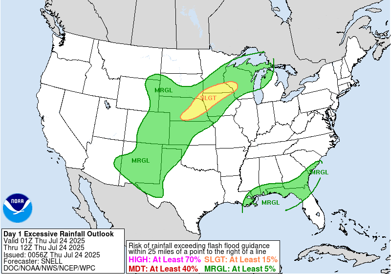 The National Hurricane Center has identified an area of interest in the Gulf of Mexico. While there are long odds of a tropical storm actually forming, what is very likely is that rainfall associated with tropical moisture will fall on our area. The center of the storm does appear to be heading further south than anticipated, which will keep the worst of the rainfall over the open ocean. Most, if not all, of the forecast area might escape with less than a half inch of rain today. Local spots will get more in thunderstorms. The Weather Prediction Center has issued a Marginal risk for flash flooding today and tomorrow for areas close to the coast.