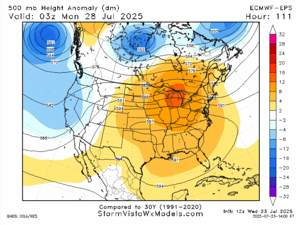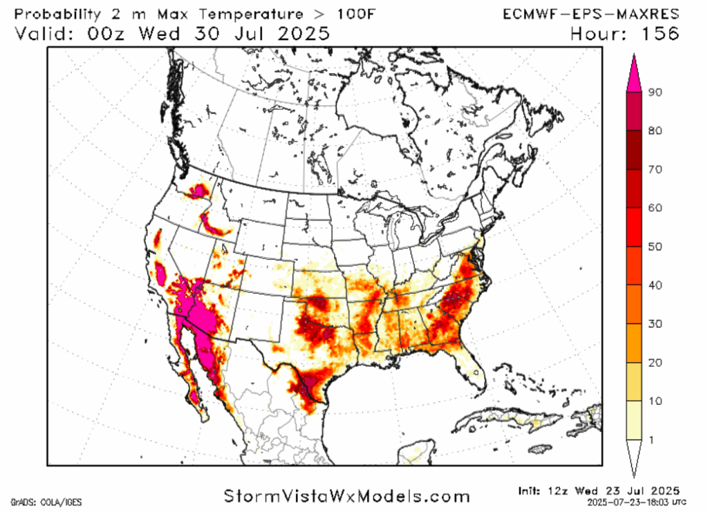 On Sunday, the “heat dome” returns to the eastern Continental United States. In the southeastern United States, this weather pattern could last most of the week. While we’re under the influence of this ridge, every day will have a similar pattern, with high temperatures in the upper 90s to potentially reaching 100 during the middle of the week. Diurnal heating will cause lift that will overcome the subsidence of the ridge in some areas, causing isolated thunderstorms. On any given day, the chance of rain is between 20 and 40 percent. Wind will be hard to come by in inland areas where sea breezes won’t have an impact. Things may cool later in the week, but it won’t feel any better as humidity associated with another tropical system approaches. Overall, prepare for a very hot time next week.