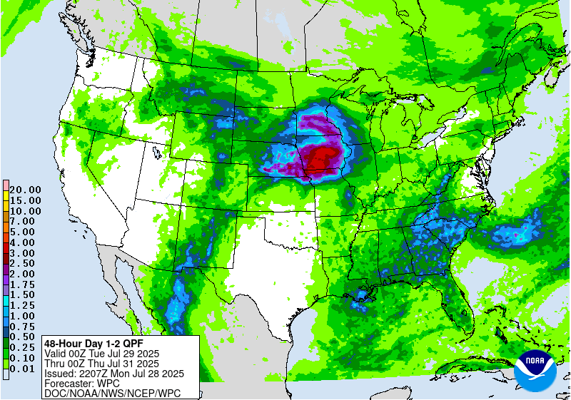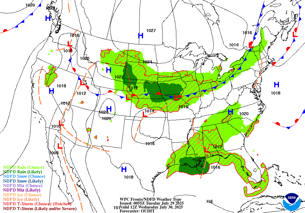 The WPC has highlighted the northern Gulf Coast as having a 20% chance of developing a tropical storm in this time frame. Even if a storm doesn’t develop, tropical moisture will likely make things wetter, especially into early next week. Around the middle of the week, temperatures will revert once again to being above average as the ridge returns.