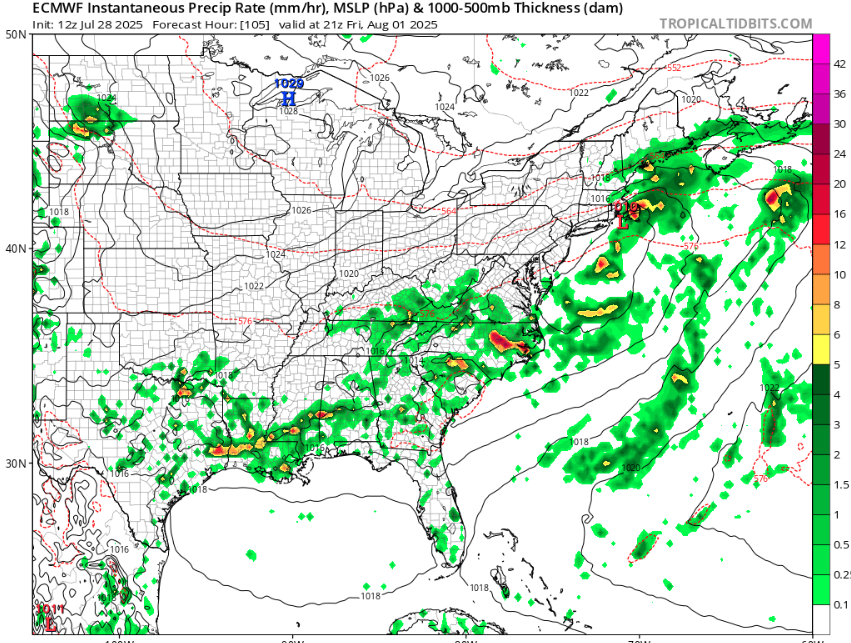 The European Model does show a squall line or two moving through the area Thursday and/or Friday. Given the high atmospheric instability, this wouldn’t be surprising. These squalls would carry a threat of damaging winds, and add to the flooding risk. The SPC hasn’t yet outlined a severe risk at the time of writing, but I wouldn’t be surprised if they did issue one in the coming days.