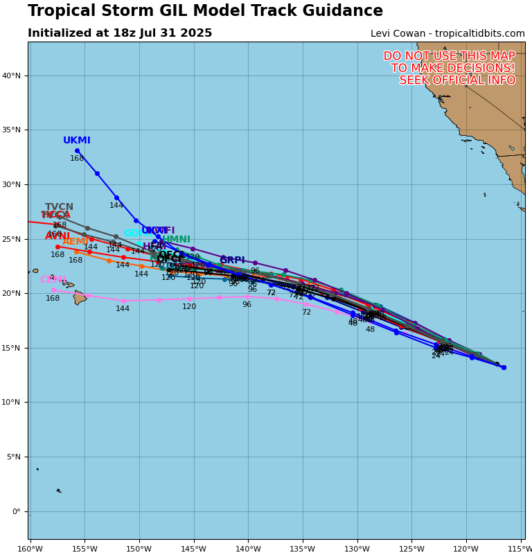 Gil is currently located well to the southwest of Cabo San Lucas, with maximum sustained winds of 50 mph, a central pressure of 1000 mb on the dot, moving west northwest at 13 mph. The environment for this storm is slightly better, with warmer ocean water, but it is still far from ideal. Some models do have this storm strengthening into a hurricane, between later today and early on Sunday, before entering a wall of wind shear and cooler water which will weaken the storm. It is moving away from Mexican shores, but in the direction of Hawai’i. It would be, at worst, a tropical storm when it gets near Hawaii, making its closest approach during middle to late next week. Aside from the areas right near the beach that might be affected by a few big waves, rain and gusty wind would be the only threats to the island chain.
