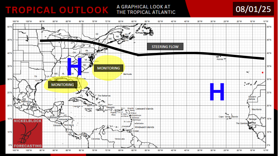 There is concern for the area shaded in the map above surrounding Florida. There is potential for an area of low pressure to form that could then get tropical characteristics if it’s over the ocean. Waters are plenty warm enough, so if there’s a break in the wind shear and enough moisture is present aloft, we could see a storm form here. A lot has to go right, so I wouldn’t peg a storm here as a particularly likely scenario at this point.