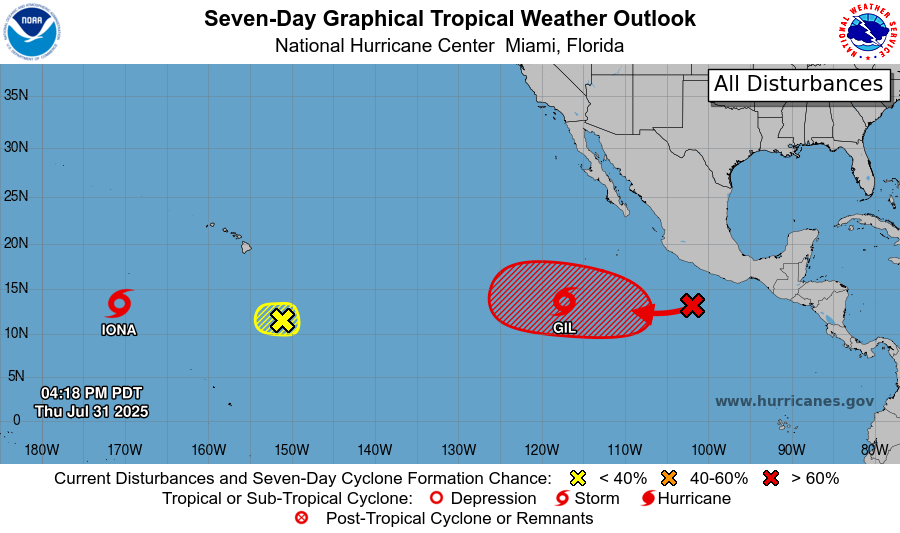 There are two storms currently in the Pacific basin, and two areas of interest for future development. None of these four systems are expected to impact land in the imminent future, although if Gil sticks together, it could make things rainy and windy in Hawai’i. The Atlantic remains quiet for now, but some omens of a more active time may be appearing.
