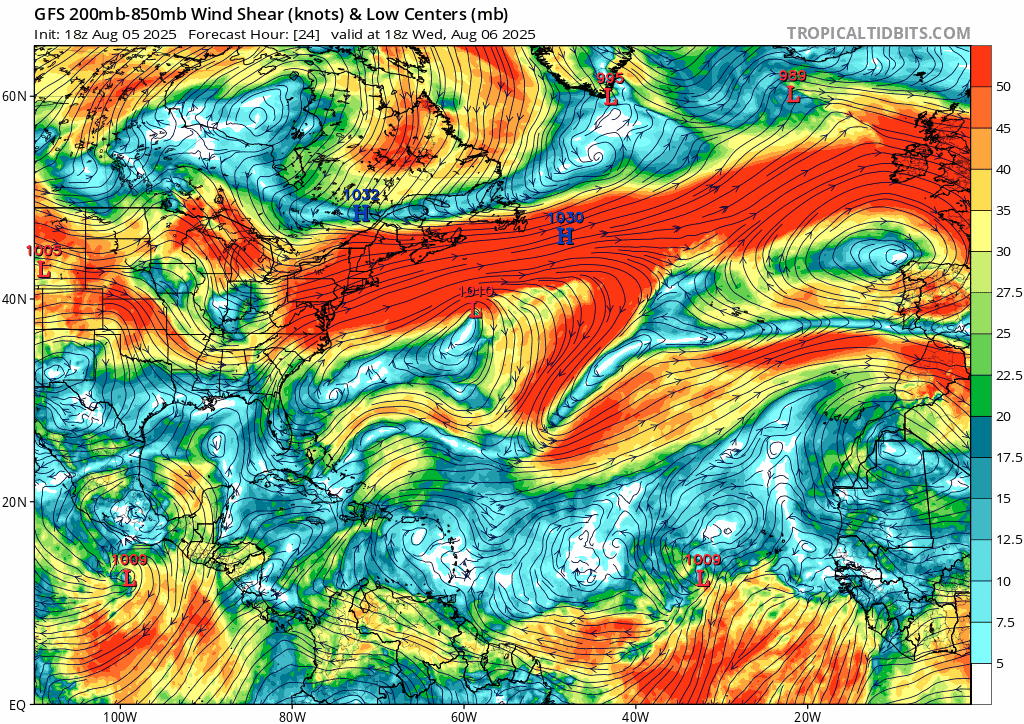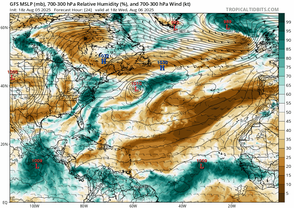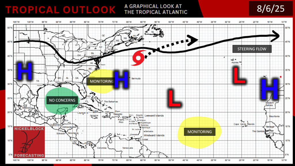 In the upper-air of the atmosphere, there are three areas of high pressure: one over Texas, the “Bermuda High”, and another over Western Sahara. There are two areas of low pressure at 500mb: one over the Azores and another in the middle of the Atlantic. I have marked Tropical Storm Dexter and where it’s headed, as well as the two disturbance areas in the Atlantic. There are no concerns as of right now in the Gulf.
