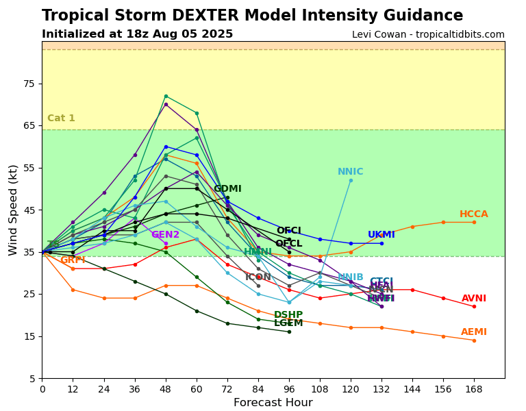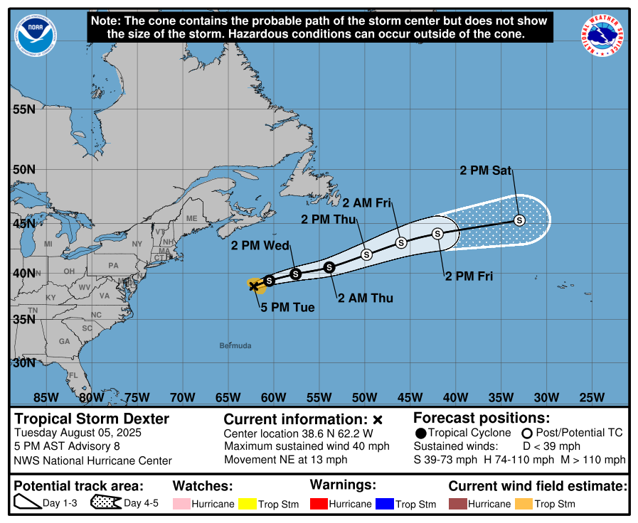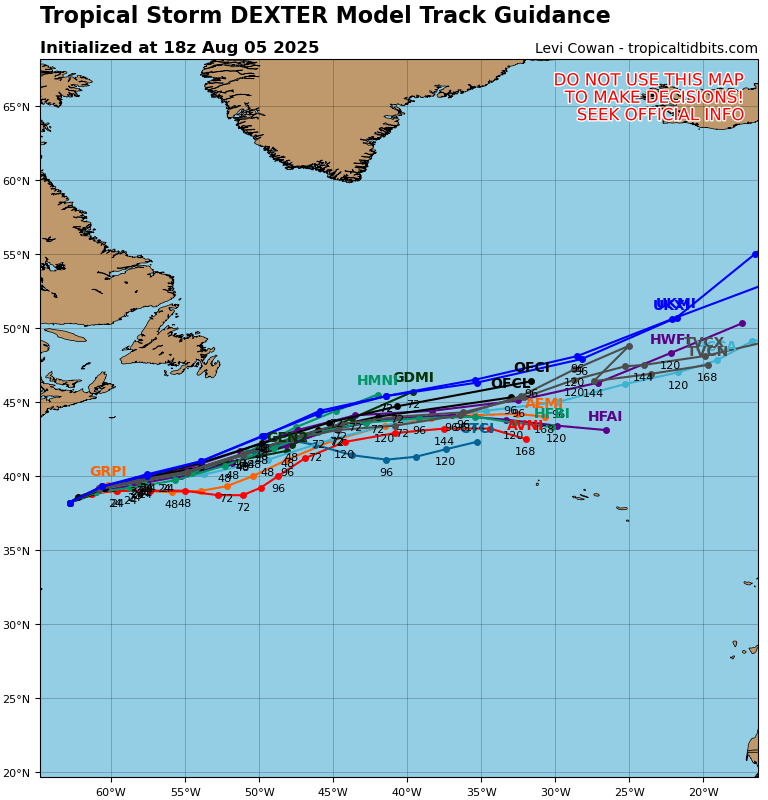 Per the NHC forecast, Tropical Storm Dexter is being steered Northeast at 13 mph by the Bermuda High and the general steering flow. Dexter has a minimum central pressure of 1005mb and maximum sustained winds at 40 mph. The NHC’s forecast track aligns pretty closely with the ensemble model tracks, so fortunately landfall and any effects on land will very likely be avoided.