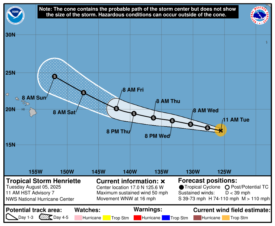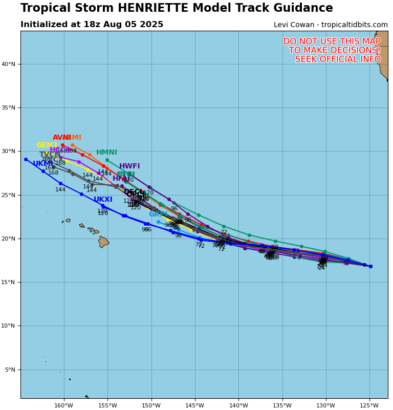 Tropical Storm Henriette is currently moving west-northwest at 16mph, and luckily is forecasted to miss Hawaii. Again, the NHC’s forecast track and the ensemble model track guidance align very closely. The effects of Henrietta, like high winds, extend about 70 miles from the center of the storm, so Hawaii also very likely won’t experience any effects from Henrietta on land.