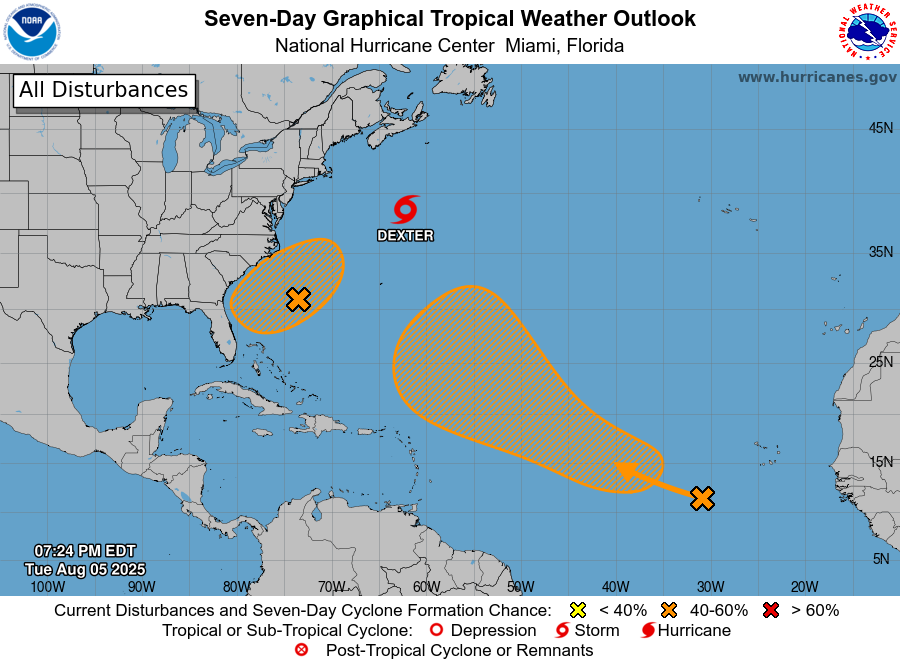 As we’re getting later into the summer, hurricane season is really starting to ramp up now, and there is quite a lot going on across the Pacific and Atlantic Oceans. In the Atlantic, we have Tropical Storm Dexter and two other disturbances. In the Pacific, there is Tropical Storm Henriette, as well as one disturbance. Let’s take a closer look at each tropical event: