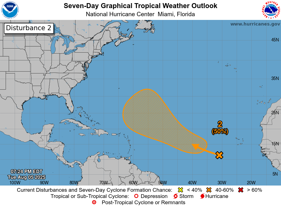 This second disturbance is also a wait-and-see situation, but a bit more long term. It has a 50% chance of development in the next seven days, and no chance at all in the next 48 hours. This disturbance formed from a tropical wave where there are large areas of showers and thunderstorms, but these storms are still very disorganized. Looking at the same conditions we looked at for the first disturbance but in this specific area, some gradual development over the next few days is definitely possible.