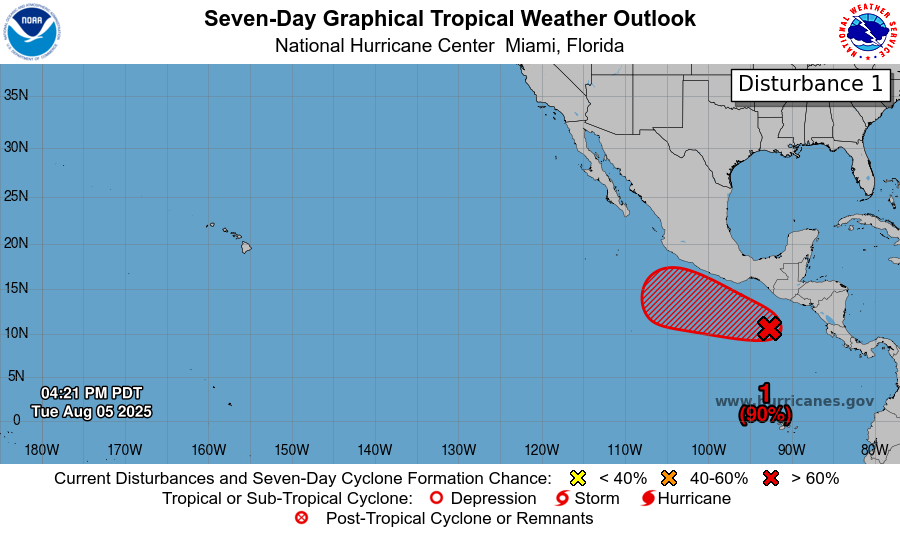 Lastly, there is one other disturbance off the coast of Mexico and Central America that is moving west-northwestward at around 15 mph. It has a 90% chance of development in the next 7 days, and an 80% chance of development in the next 48 hours. Unlike the disturbances in the Atlantic, this area of disorganized showers and thunderstorms is already associated with an area of low pressure, so tropical cyclone development is more imminent. Environmental conditions are also pointing toward tropical development.