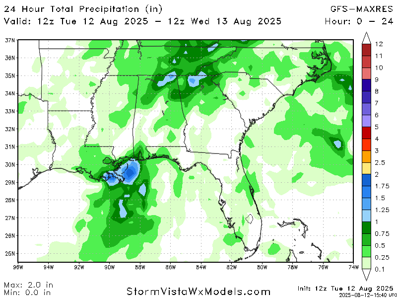 The majority of the Gulf Coast can expect to get about an inch of rain today with the exception of areas south of New Orleans receiving 2 inches maximum. Anywhere inland can expect less than an inch of rain, with some areas seeing no rain at all.