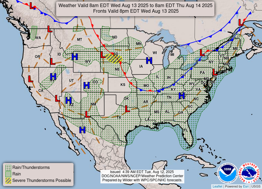 Wednesday: Mostly sunny during the day with a slight chance of showers and thunderstorms in the afternoon. Highs in the mid 90s during the day, and lows in the mid 70s at night. Chance of precipitation 20%.