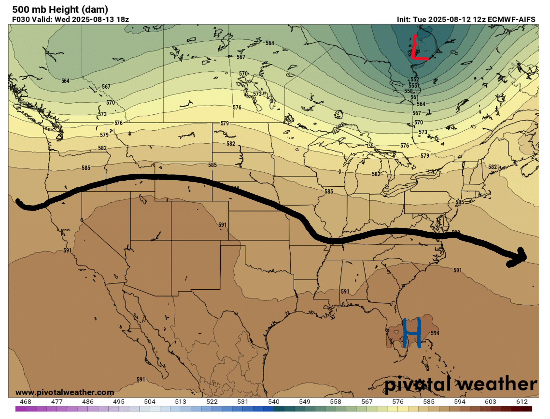 Looking at our 500 mb chart, there is some mild troughing to our left, helping to increase rain chances. This troughing pattern will continue until Thursday, and then on Friday some ridging will start to build in to our left and then move eastward.