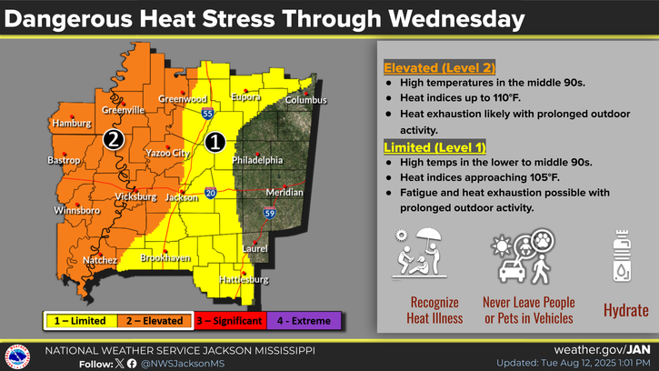 Today’s main concerns will be high heat throughout our region and some persistent showers along the Gulf Coast. Temperatures will reach to low to mid 90s today, and high humidity will make it feel much hotter than it actually is. There are no active heat warnings, but heat safety precautions should still be taken.