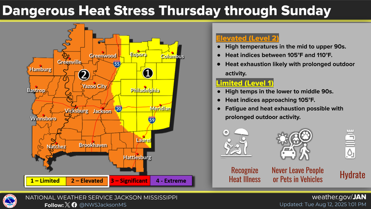 Thursday: Mostly sunny during the day with a chance of showers and thunderstorms in the afternoon. Highs in the low 90s during the day, and lows in the mid 70s at night. Chance of precipitation 60%.