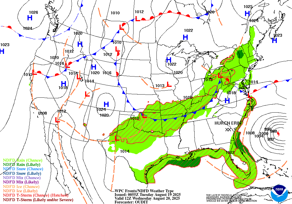 Thursday: Partly cloudy, chance of an afternoon thunderstorm. Watching the tropics. Highs in the low 90s. Chance of rain 40%. Lows in the mid 70s.