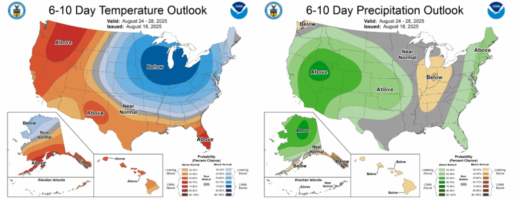 A big time trough will be in place over the Great Lakes region, and the periphery of this ridge will encroach on our area at times, keeping temperatures from getting too warm. Teleconnections are also suggesting more average temperatures, which for this time of the year is around 90 degrees. For precipitation, on the one hand, the trough will cause winds to blow from the north over land, preventing some Gulf moisture from causing rain. On the other hand, troughs allow for more rising air, allowing more convection. I’d expect a 30-40 percent chance of afternoon thunderstorms most days next week.