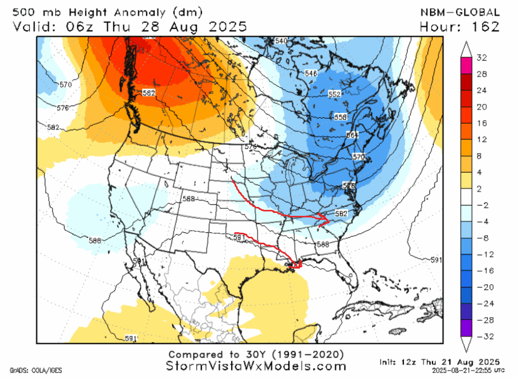 If you are weatherwise, you will likely soon hear about much cooler than average conditions in the Midwest. This is mainly driven by a very large trough that will settle in over that area. The guidance suggests that our forecast area will be on the periphery of this trough, between it and a much weaker ridge to the south. This setup will last throughout the week. Thursday and Friday look to be the coolest days as a ridge to our southwest will aid in funneling in cooler weather from the northwest as shown above. It’s possible the high temperatures won’t even crack 85 on either day. This is the “fool’s fall” I spoke of previously. It’s possible some more frontal activity will increase rain chances in the beginning of the week, but model composites seem to agree that rain chances will go down as the week goes on.