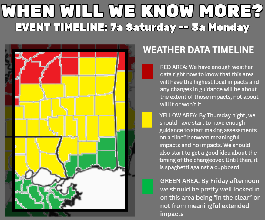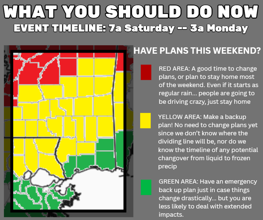 I have heard from a number of folks with plans this weekend asking about changing plans given the forecast. And I can’t tell anyone living south of I-20 to “change plans” yet. I think it is a really, really good idea to have a backup plan, though.