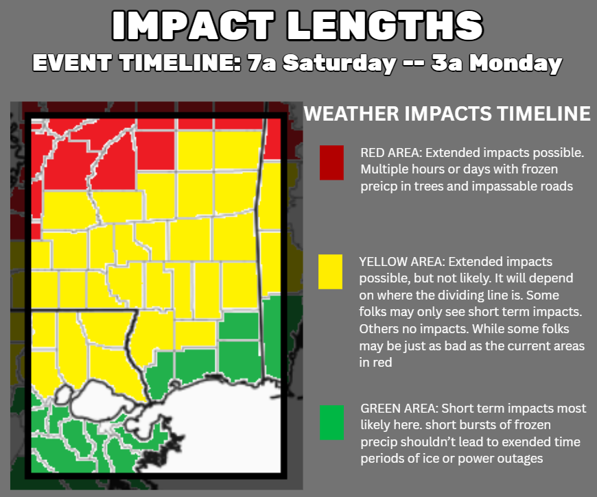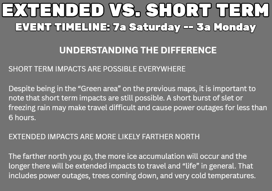 While folks dealing with extended impacts can expect to deal with freezing rain and sleet for a while. More than 6 hours and impacts that last more than 12 hours. Perhaps a few days. So if you live somewhere that is expecting extended impacts, prepare for being without power or unable to travel for a day or two. Maybe even three.