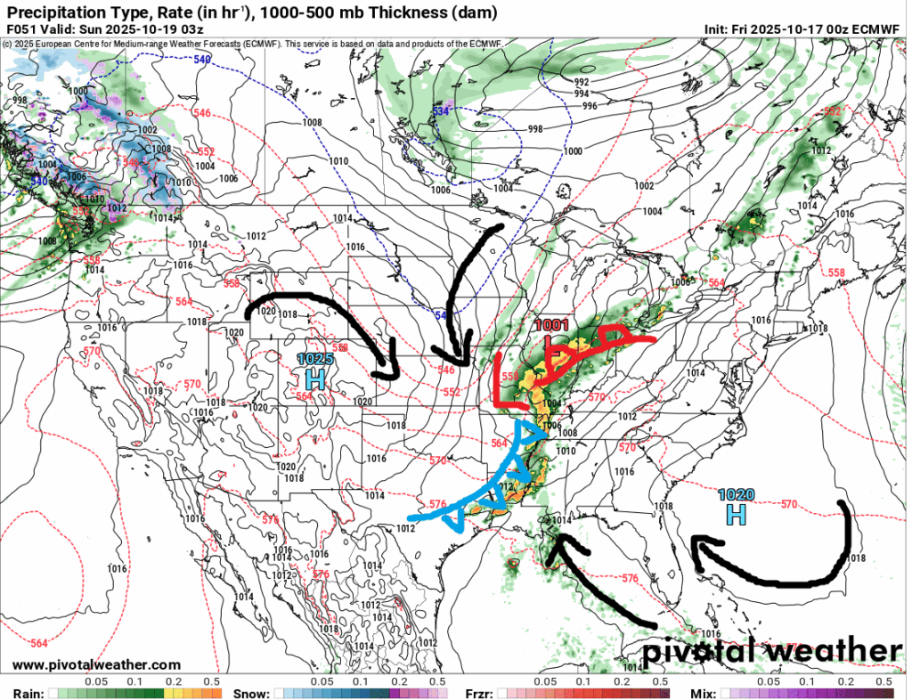 The area of low pressure should push a cold front through the area late Saturday night and into Sunday morning. Ahead of it, the black arrows show the warmer air being pulled north from the Gulf and open Atlantic. And the other black arrows to the north show the direction the air is coming in from the Great Plains and Canada.