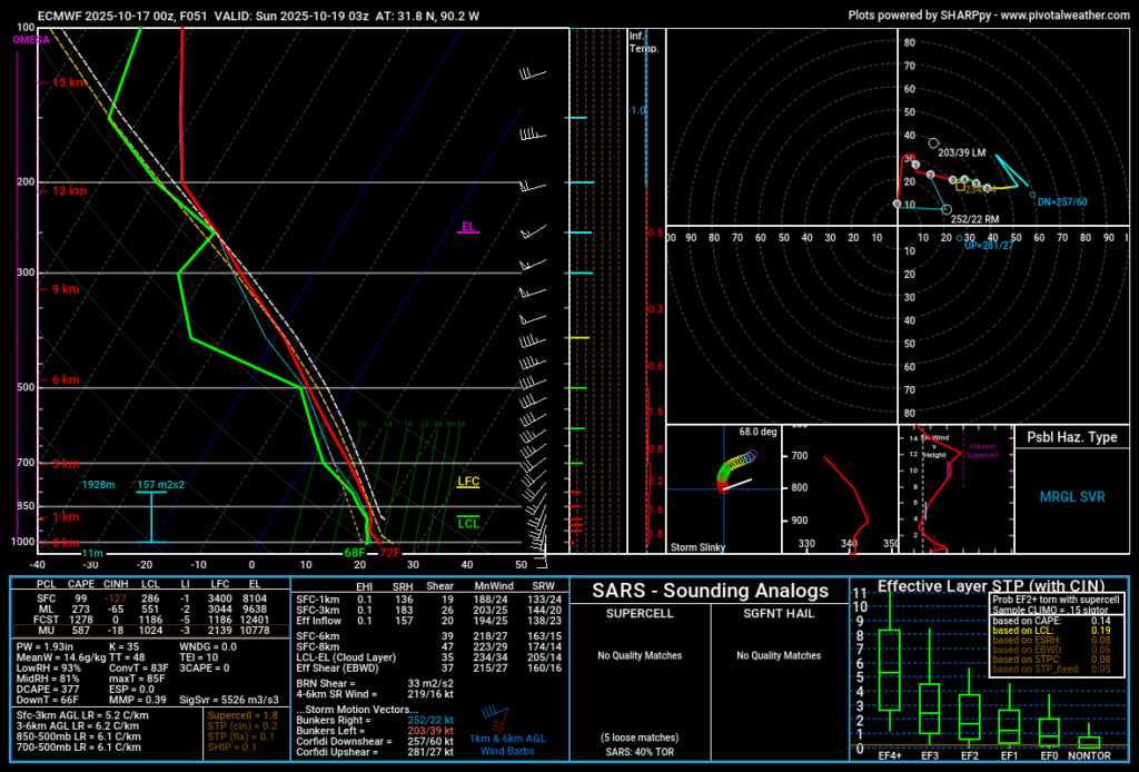 Forecast model guidance skew-t charts show a reasonable amount of shear and helicity in place. Plus a surface-based Effective Inflow Layer. So, if we have any instability, we have a surface-based inflow section that has winds turning with elevation to promote the development of rotating updrafts that could get rooted at the surface.