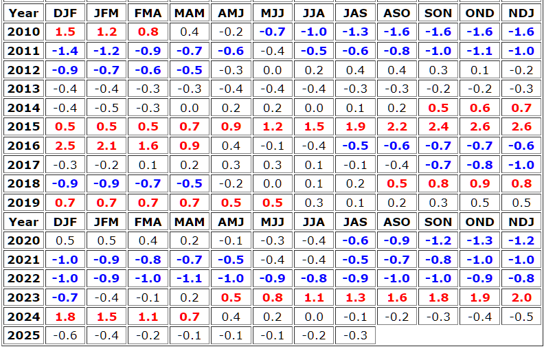 This early Winter peak for La Nina was last done in 2022. But that was a higher peak than we are expecting. Instead, this year we are expecting a bit of a muted La Nina. So we have to go back to 2016 to get a year that may look like this year for ENSO.