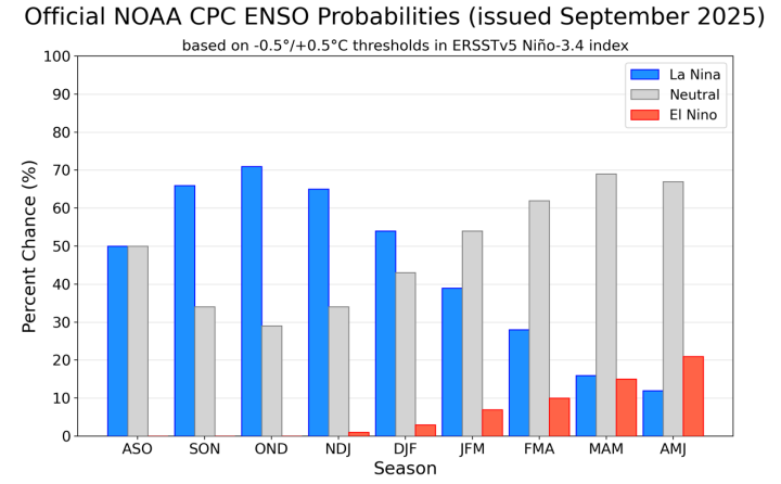 As we move into this autumn, the Climate Precision Center is showing a good shot for La Nina (ENSO) to peak sometime between now and the end of December.