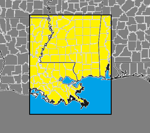 While this outlook is mainly for the entire Gulf Coast, I want to take a moment to highlight some specific forecast points for the Southern MS/AL/LA region. That is the area in yellow on the map below.