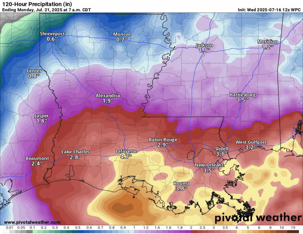 The center of low pressure will likely move into southeastern Louisiana by later today and bring with it heavy rain. As you can see from the Weather Prediction Center’s (WPC) total accumulated rainfall forecast through Monday morning, as much as 3-5 inches of rain is what most areas will see, but some areas could see up to a foot possible when things are all set and done. Current guidance has the bulk of the highest rain totals in southern Louisiana, but it all depends where those heavy rain bands set up. The WPC has a Slight (at least 15 percent) chance of excessive rainfall and flash flooding for our general area. For areas further in southwest Louisiana, the WPC is more concerned with heavy rainfall rates of 2-3” per hour, which could cause some major flash flooding. Ensure you have a plan in place if you live in a low lying area and heed all NWS warning when they come through.