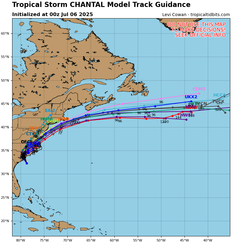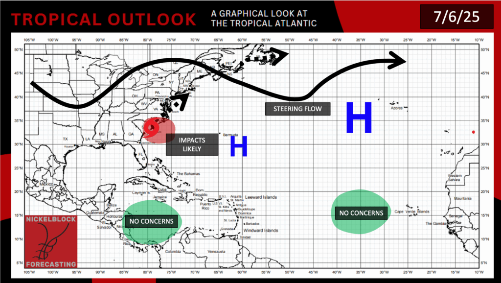 Our Atlantic Basin setup is showing our first red-highlighted “Impacts Likely” marker for the CONUS this hurricane season with Tropical Storm Chantal. No other areas of concern are likely in the next 7 days. Let’s look at Chantal’s impacts: