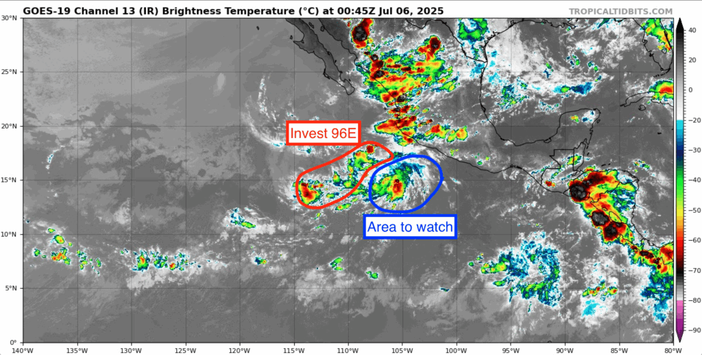 Just around 96E is another area to watch by the NHC. This one is not yet an Invest, given its low 0 percent chance of tropical development in the next 48 hours and 20 percent chance in the next 7 days. If this were to form, models have it tracking a similar path to 96E. We will be keeping an eye on both of these systems.