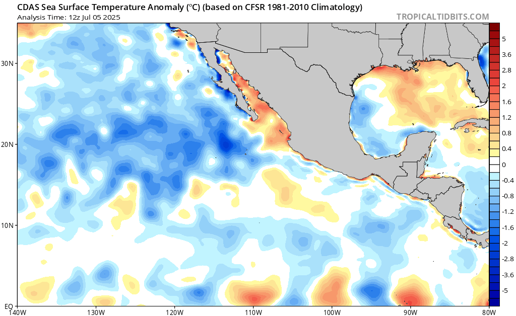 Sea surface temperatures are responding to the increased tropical activity in the basin. With each system we have seen, they have churned up the sea, upwelling deeper cooler waters which is bringing the basin closer to average, and in some spots cooler than average. This is why these systems will not become anything too significant if they do develop – their fuel is limited.