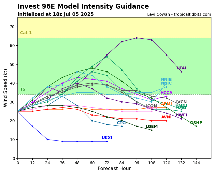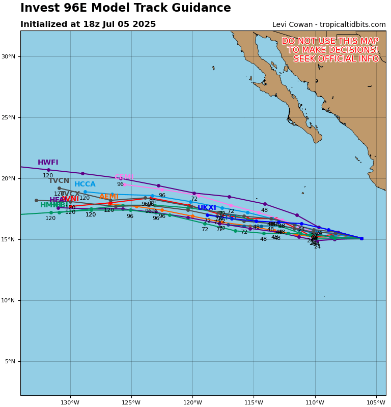 Invest 96E has a decent chance of development, with a majority of the models maxing it out as a tropical storm in the next few days and taking it right out to sea to the west.