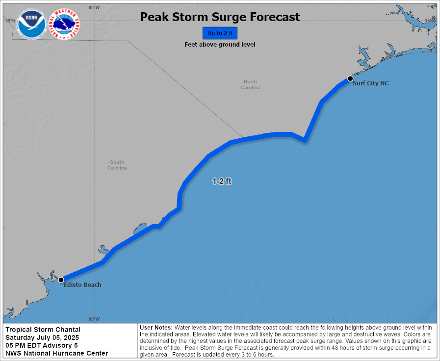 Tropical Storm Chantal is making landfall this morning in central/northern coastal South Carolina with winds from 30-40 mph, heavy rainfall, and up to 2 feet of above ground storm surge. Heavy rainfall will cause a threat of flash flooding through Monday, especially in urban areas, the NHC says. Through the next few days, life threatening rip currents will be a concern up into the mid-Atlantic and northeast.