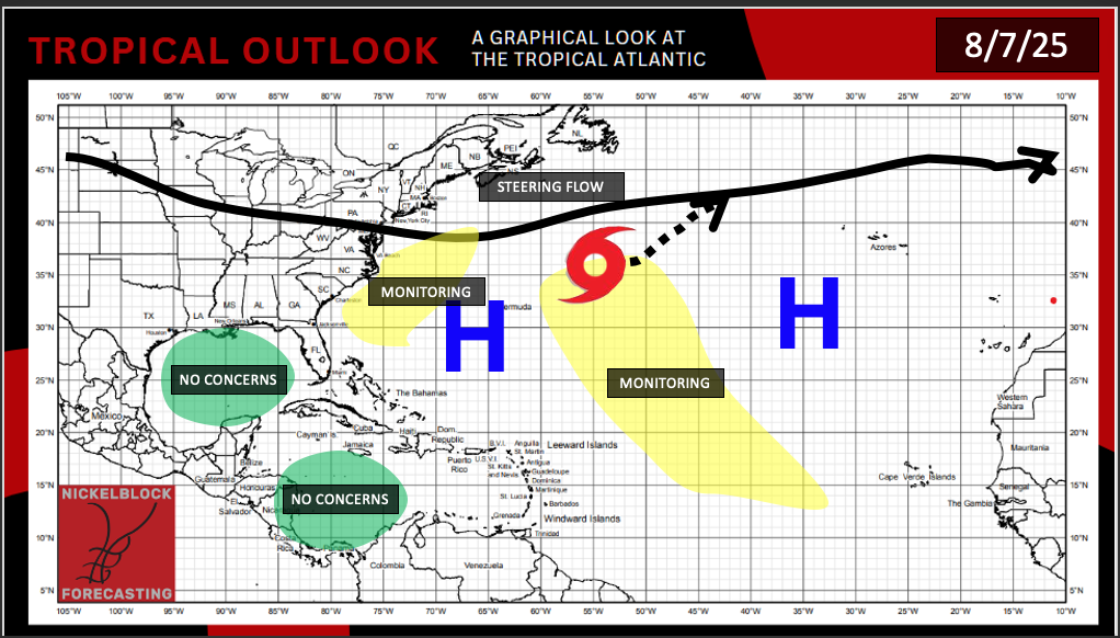 Here’s a look at the latest tropical outlook in the Atlantic. We’re currently monitoring two areas in the Atlantic for possible development. One is in the eastern Atlantic and the other is closer to the Southeast U.S. coast. Neither pose an immediate threat at this time, but we’ll be watching how the high pressure and steering flow set up. The Gulf and Caribbean remain quiet with no concerns for now.
