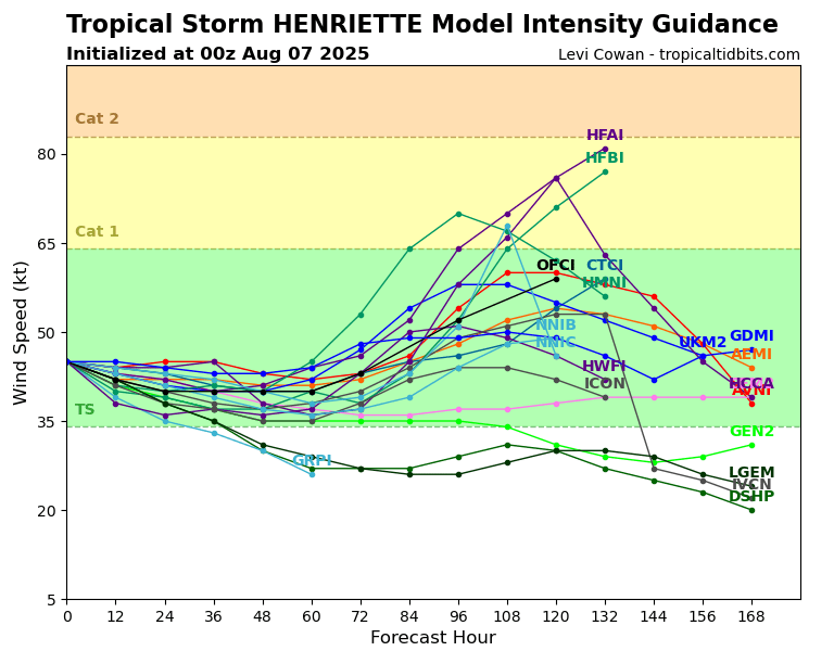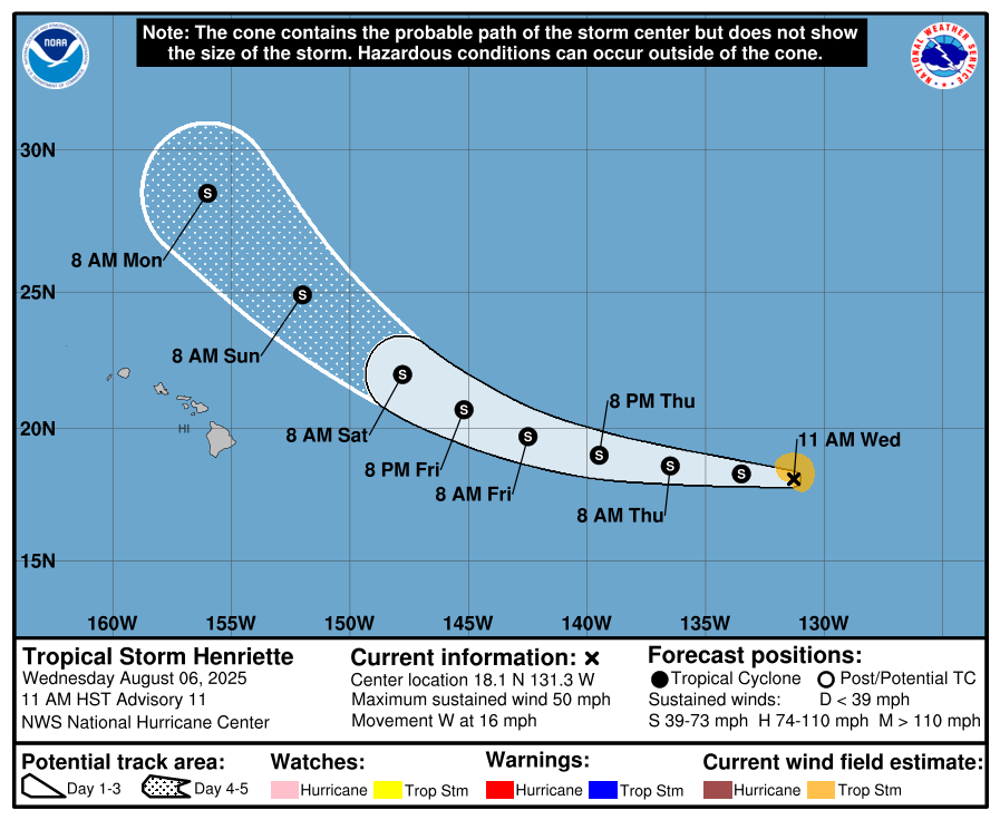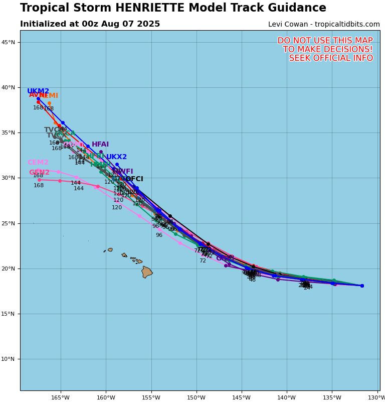 Henriette is a weak tropical storm, with maximum sustained winds at 50 mph, moving to the west northwest at 16 mph. It is losing quite a bit of its organization with it’s convection visibilly winding down. The storm is expected to gradually weaken over the next few days, but could increase strength a little bit after passing by Hawaii, due to an energy transfer from a passing trough.